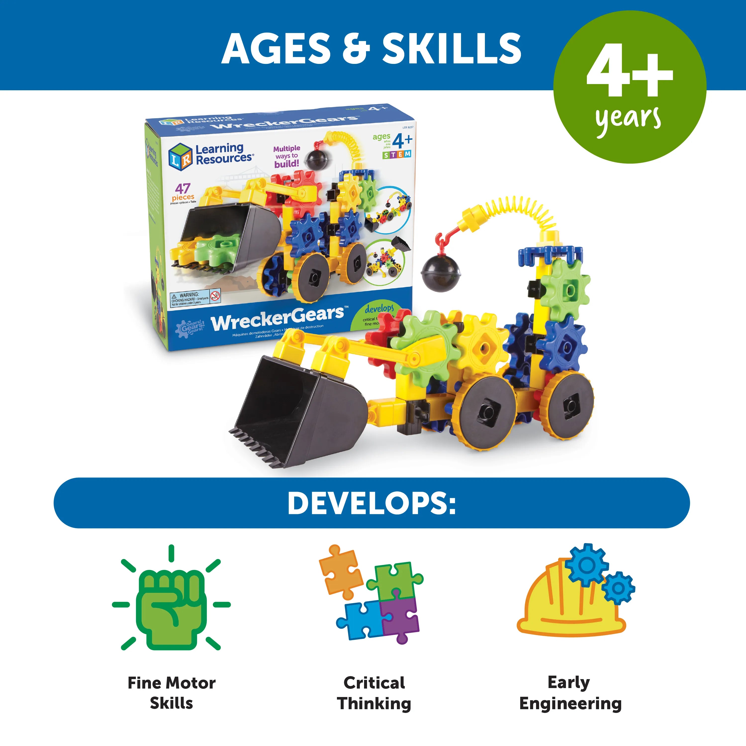 Perfect for developing fine motor skills, problem-solving, and an understanding of gears and motion, WreckerGears™ inspires young inventors to experiment with different designs and functions. Its colorful, modular pieces make constructing and learning about mechanisms both fun and educational. Gears! Gears! Gears!® WreckerGears™ is a fantastic way to introduce kids to engineering principles through imaginative, moveable vehicle creation.